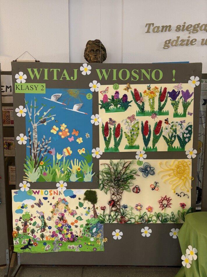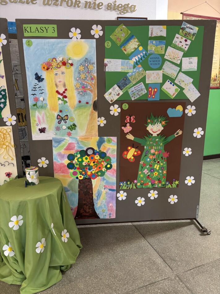 Pięknie i kolorowo zrobiło się na holu dzięki uczniom z klas 1-3, którzy przywitali nową porę roku konkursem plastycznym 'Wiosna w moich oczach”. Jak co roku powstały niezwykłe, barwne i kreatywne obrazy.